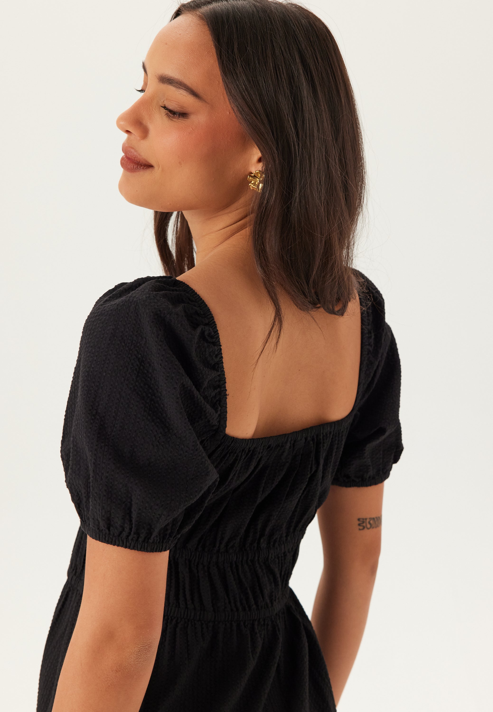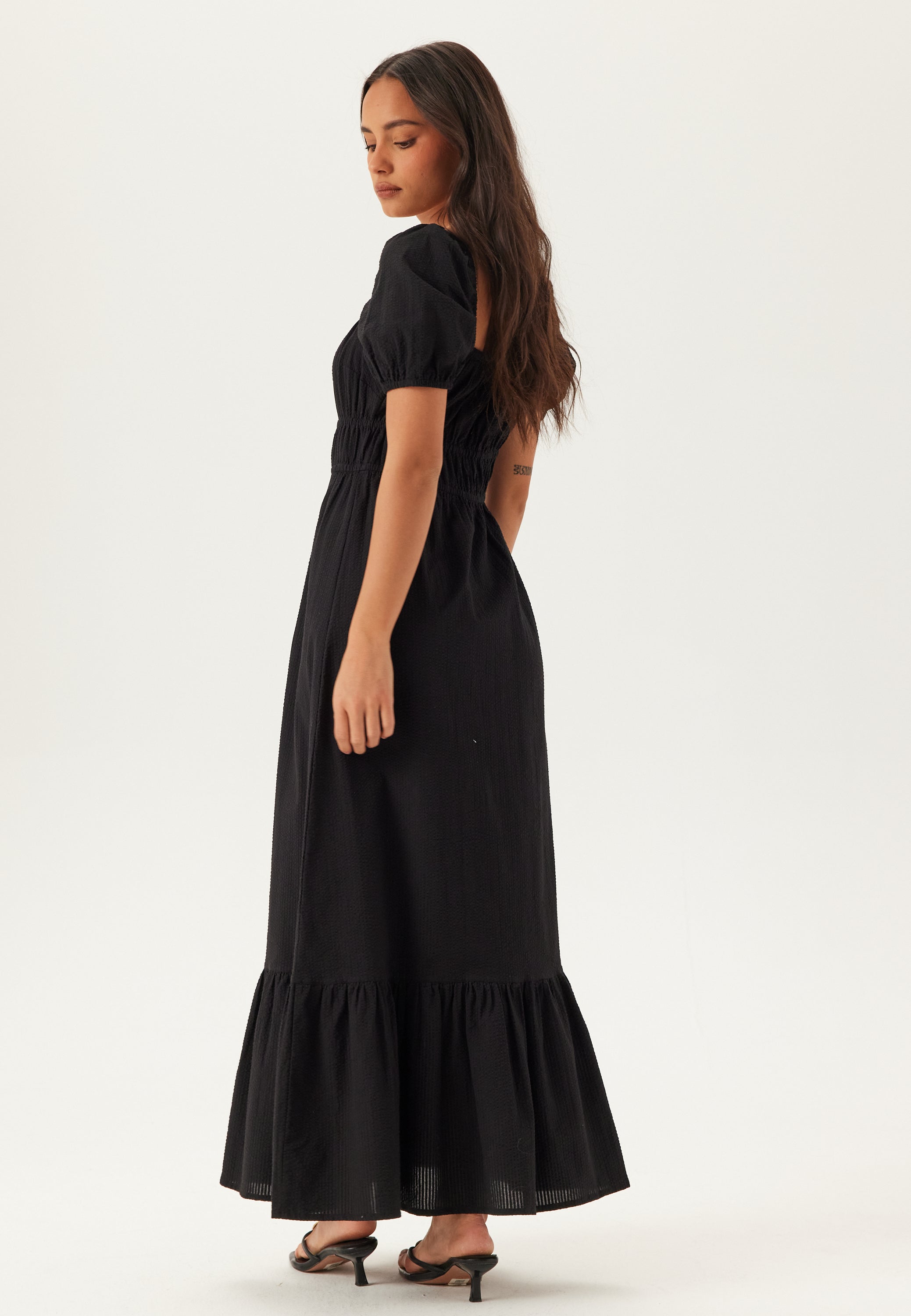 Draag hem overdag met platte sandalen, of combineer hem met sandalen met hak en simpele sieraden voor een etentje of een avondje uit op vakantie. Dit is zo’n lange zwarte jurk die makkelijk te stylen is, heerlijk draagt en altijd een goede keuze is als je comfort, vorm en net wat extra textuur in één wilt.